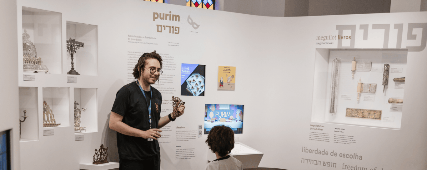 Purim celebra a história de resistência do povo judeu protagonizada pela coragem de uma mulher, a Rainha Ester. O núcleo de Educação & Participação oferece visita dedicada a essa celebração, com a apresentação da histórica e de elementos simbólicos da festa.