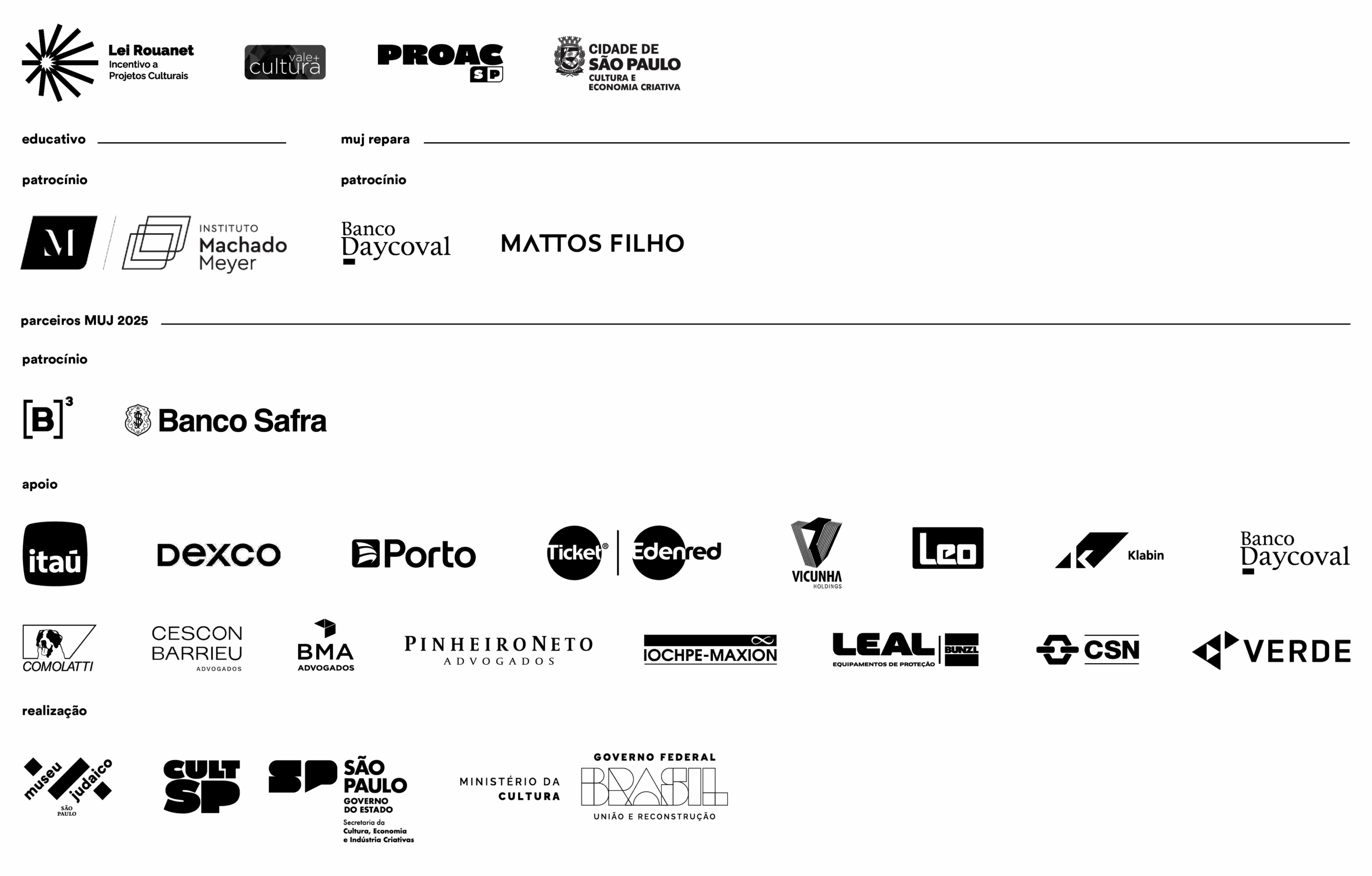 O Museu Judaico de São Paulo é muito grato às pessoas, fundações e empresas listadas abaixo. As doações diretas fornecem apoio irrestrito para as exposições, programas educacionais e operações do Museu em 2025.